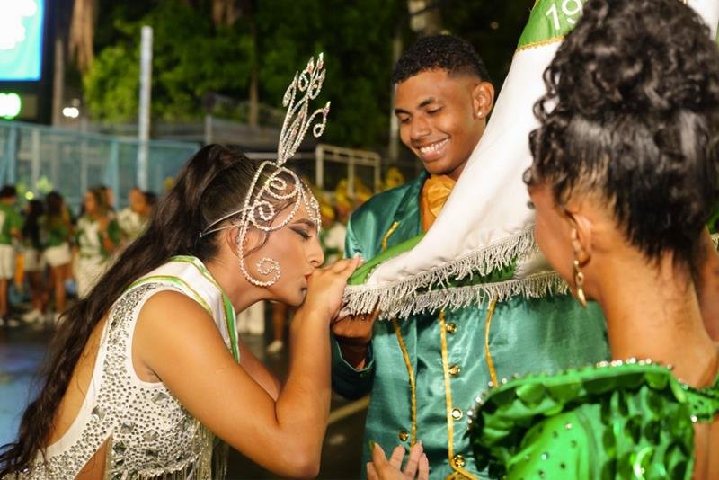 A emoção foi completa para a influenciadora que oficializou sua presença como musa antes do ensaio, quando recebeu a faixa das mãos de Dhiego Gervazzoni, coordenador das beldades que desfilarão na escola este ano.